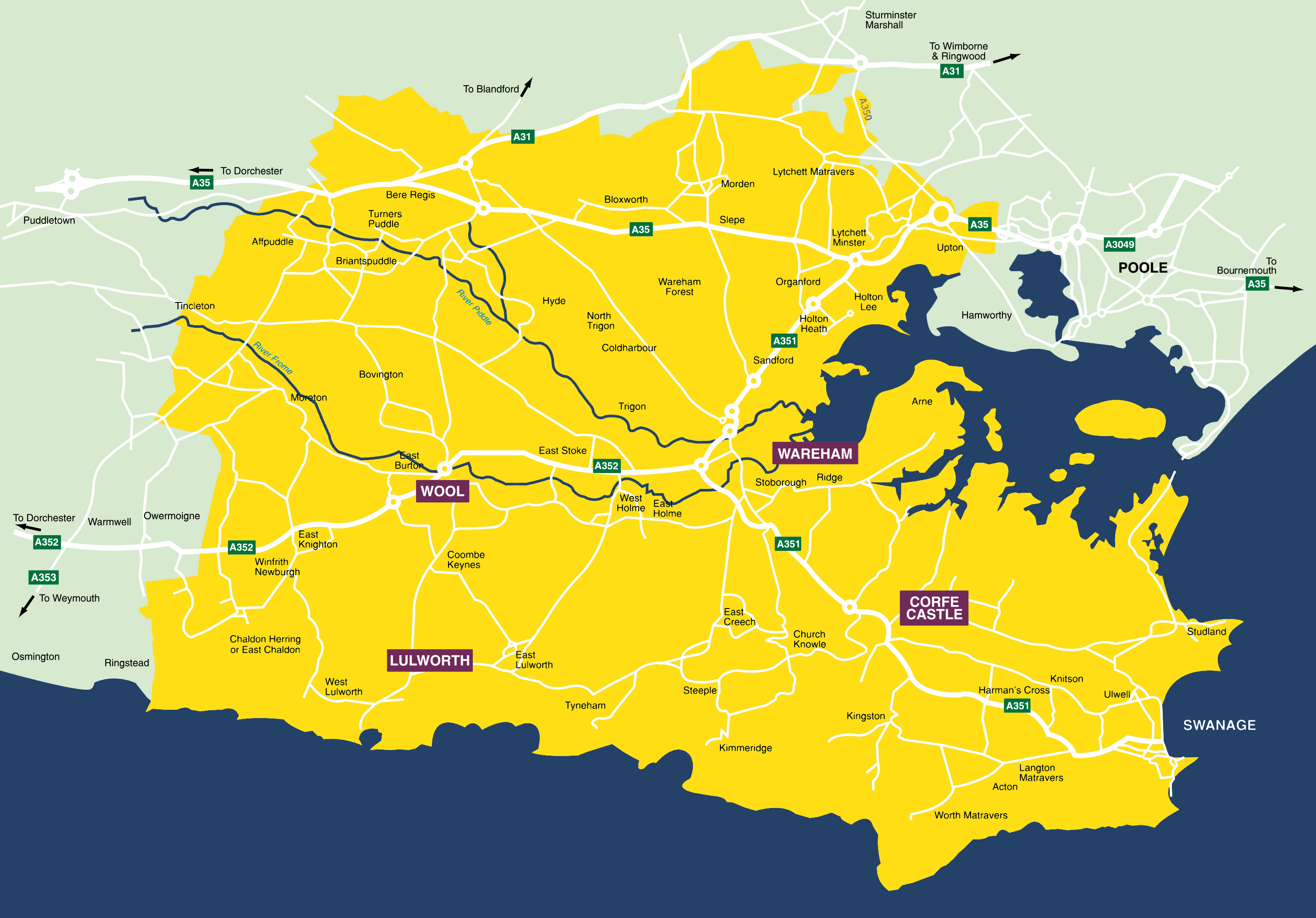 Affpuddle, Arne, Bere Regis, Bloxworth, Bovington Camp, Briantspuddle, Chaldon Herring Or East Chaldon, Church Knowle, Coombe Keynes, Corfe Castle, Crossways, East Creech, East Knighton, East Lulworth, East Morden, East Stoke, Furzebrook, Harman’s Cross, Holton Heath, Holworth, Kimmeridge, Kingston, Lane End, Langton Matravers, Lulworth Camp, Lytchett Matravers, Lytchett Minster, Moreton, Norden, Sandford, Slepe, Steeple, Stoborough, Stokeford, Studland, Swanage, Tolpuddle, Turners Puddle, Tyneham, Wareham, West Holme, West Lulworth, West Morden, Winfrith Newburgh, Wool and Worth Matravers.